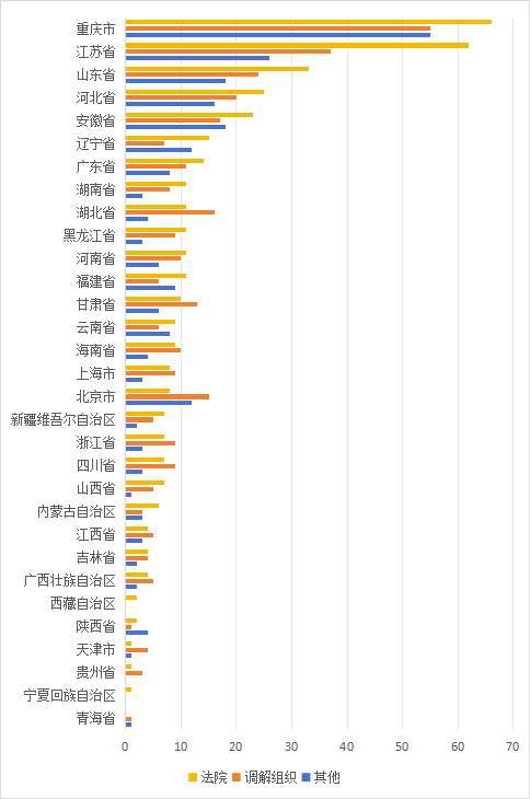 549例多元解纷案例中化解单位包含法院的有387例,总占比约70%,共涉及30个省级行政区域。其中重庆市、江苏省案例数量位居前列,均超60例,分别有66例、62例。10例至60例之间的包括山东省、河北省及安徽省等11个省级行政区域。从具体法院来看,387例化解单位共涉及316家具体法院,重庆市渝中区人民法院化解数量最多,有6例。