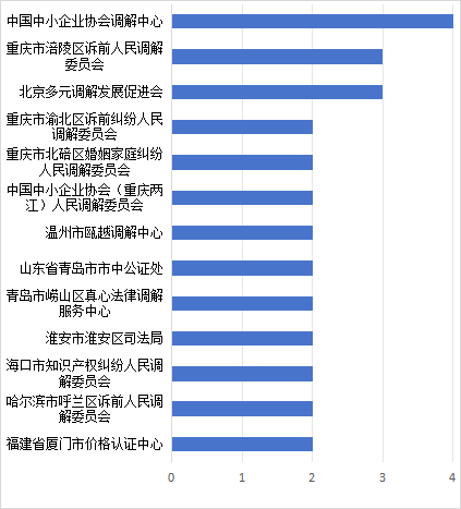 549例多元解纷案例有327例化解单位包含调解组织,总占比约60%,共涉及29个省级行政区域。其中案例数量前五位的依次是重庆市、江苏省、山东省、河北省及安徽省,与法院前五位地域一致,分别有55例、37例、24例、20例及17例。从具体调解组织来看,327例案例共涉及376家人民调解委员会、调解中心等调解组织,其中,中国中小企业协会调解中心化解的最多,有4例。
