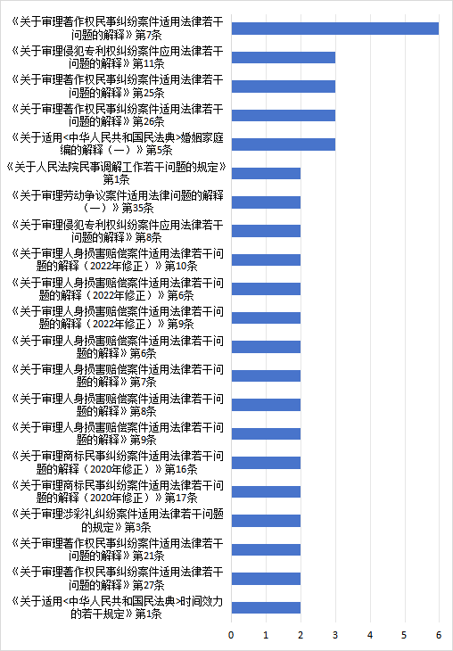 51部司法解释共引用104条司法解释条文,引用次数最多的为《关于审理著作权民事纠纷案件适用法律若干问题的解释》第7条,共引用6次;《关于适用中华人民共和国民法典婚姻家庭编的解释(一)》第5条、《关于审理著作权民事纠纷案件适用法律若干问题的解释》第26条和25条、《关于审理侵犯专利权纠纷案件应用法律若干问题的解释》第11条均引用3次;《关于适用中华人民共和国民法典时间效力的若干规定》第1条、《关于审理著作权民事纠纷案件适用法律若干问题的解释》第27条及《关于审理涉彩礼纠纷案件适用法律若干问题的规定》第3条等17条司法解释引用次数均为2次。