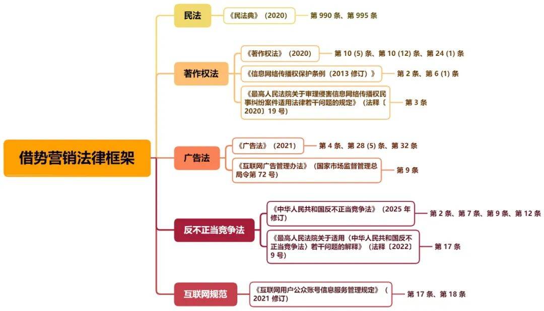 不同形式、内容的借势营销策略,可能会面临不同程度、不同类型的法律风险,我们对我国借势营销的相关法律规定及可能涉及的风险简要梳理如下: